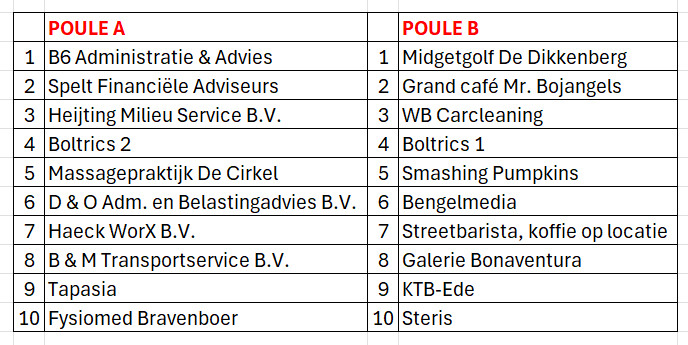 In Poule B speelde koploper Midgetgolf de Dikkenberg tegen Bengelmedia en de midgetgolfers moesten na spannende strijd een 15-15 remise incasseren. Runner-up, Grandcafé Mr. Bojangels, speelde tegen Streetbarista koffie op locatie en kwam door een mooie 18-12 overwinning een aantal punten dichterbij de koppositie. WB Carcleaning deed het prima tegen het hoog op de ranglijst staande Boltrics I en won met 19-11 waardoor de autopoetsers stegen naar positie 3. Smashing Pumpkins had het lastig tegen rode lantaarndrager Steris en kwam tot een moeizame 15-15 remise.